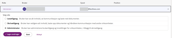 - Velg rolle og klikk på Lagre endringer eller Slett bruker